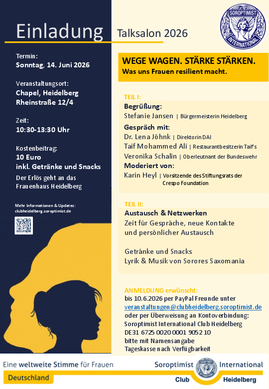 Der SI-Club lädt auch in diesem Jahr herzlich ein zu einem vielfältigen soroptimistischen Programm mit Veranstaltungen aus den Bereichen Kunst und Kultur sowie gesellschaftlichem Engagement. Der Club Heidelberg engagiert sich für Gleichberechtigung, Bildung und die nachhaltige Stärkung von Frauen und Mädchen. Die Erlöse unserer Veranstaltungen kommen vollständig sozialen Projekten zugute.