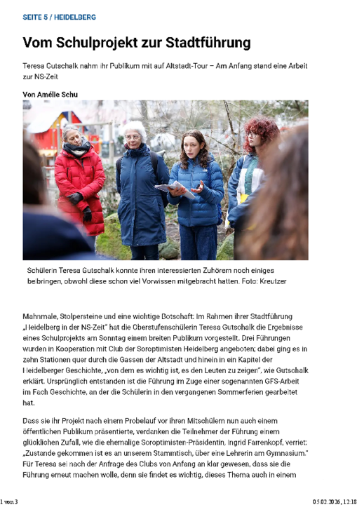 Am 1. Februar 2026 fanden in Heidelberg drei Stadtführungen zum Thema „Heidelberg in der NS-Zeit“ statt. Organisiert wurden sie in Kooperation mit dem SI-Club Heidelberg.